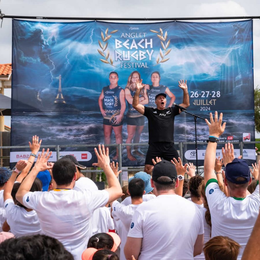 La Nouvelle Zélande s’invite à l’Anglet Beach Rugby Festival : Être dans la peau d’un All Black le temps d’une danse ! Maoris et anciens rugbyman, ils réalisent le Haka Ka Mate traditionnel sur le podium officiel et associent le public enthousiaste d’Anglet.